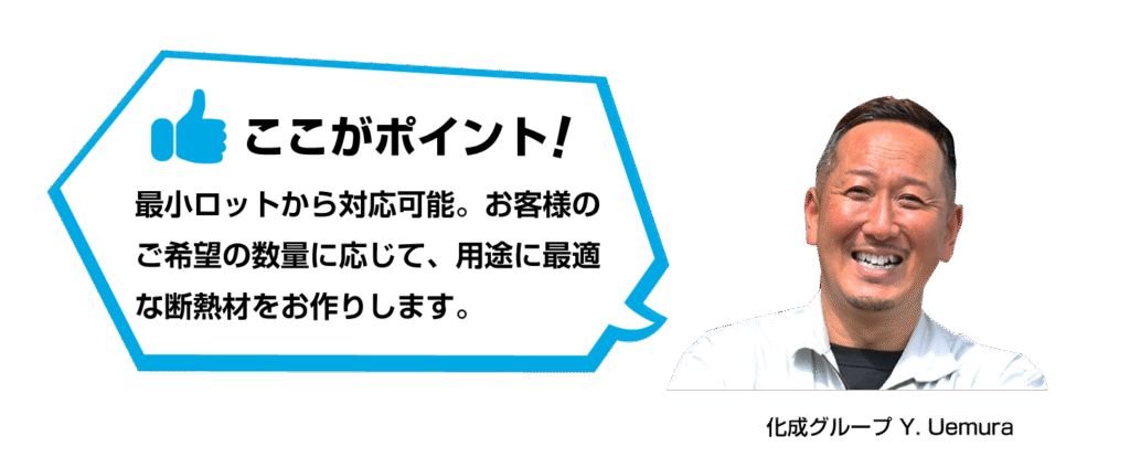ニッケー工業では、発泡樹脂やグラスウールの断熱特性を活かした製品を、幅広いニーズに合わせて提供しています。月産40万個という圧倒的な生産量を誇り、1日あたり約1,500種類もの裁断加工に対応。その約9割は小ロット生産で、お客様ごとの細かなご要望にも柔軟に応えています。さらに、過去の製品データもデータベースで一元管理しており、必要な情報をスピーディーに取り出すことが可能です。